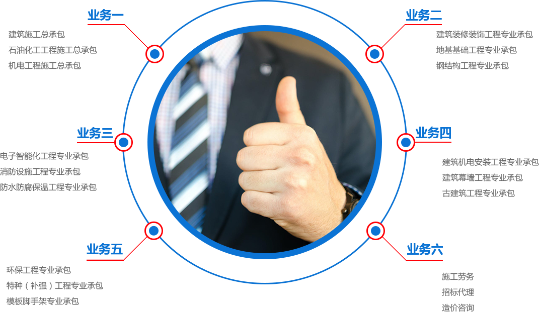 建筑施工總承包貳級、石油化工工程施工總承包叁級、機電工程施工總承包叁級、建筑裝修裝飾工程專業承包貳級、鋼結構工程專業承包叁級,地基基礎工程專業承包叁級、電子智能化工程專業承包貳級、消防設施工程專業承包貳級、防水防腐保溫工程專業承包貳級、建筑機電安裝工程專業承包叁級、建筑幕墻工程專業承包貳級、古建筑工程專業承包叁級、環保工程專業承包資質叁級、特種(補強)工程專業承包不分等級、模板腳手架專業承包不分等級、施工勞務不分等級、招標代理、造價咨詢乙級等。